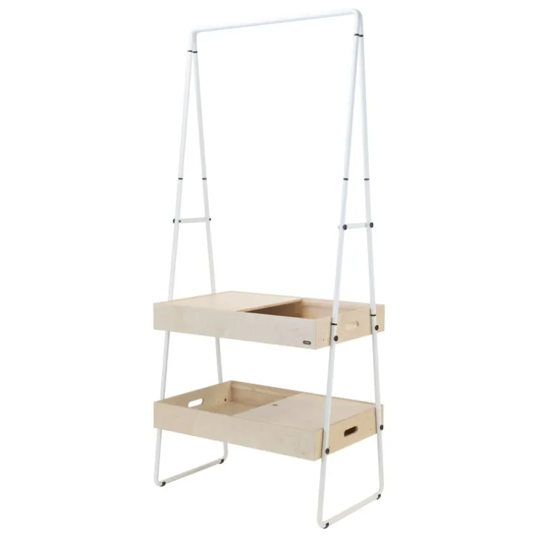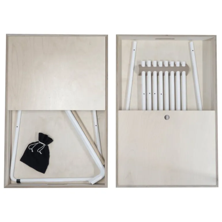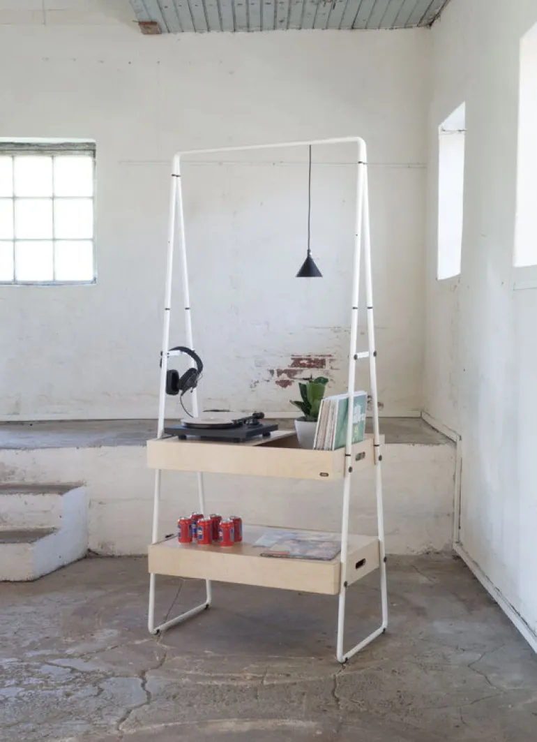 Den minimalistiska disken är tillverkad av björkplywood och galvaniserat stål och får plats i små utrymmen för förvaring eller transport: metalldelarna inuti korgens trälåda fungerar som diskens två hjul. Disken är enkel att sätta ihop och ta isär helt utan verktyg och det tar endast cirka tio minuter.