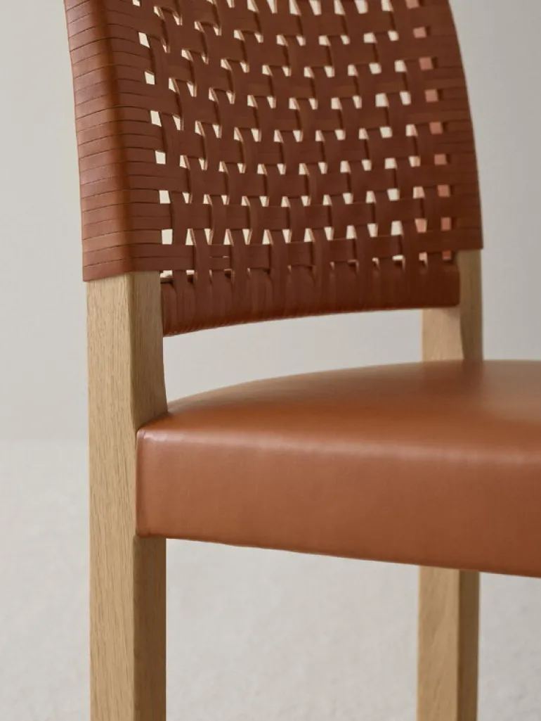 Näyttely stolen från Ornäs har en robust ram av massivt trä med en stoppad, klädd sits och en dekorativ flätad rygg, vilket gör stolen lätt att känna igen och behaglig att sitta i. Näyttely stolen är ett sant mästerverk av skickligt hantverk – att fläta och klä stolen tar till och med en erfaren hantverkare en hel dag att slutföra.