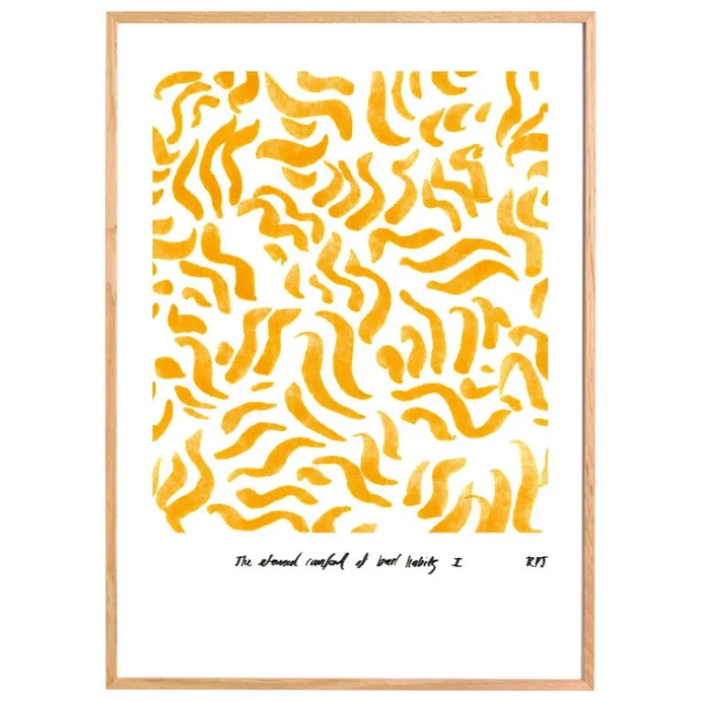 Paper Collectives Comfort – Yellow poster illustrerar en tolkning av landskap under snabb förändring, sedda från ett flygplan. Postern är målad i gult bläck och tillhör en kollektion med abstrakta landskap av den sydafrikanska konstnären Ronelle Pienaar Jenkin och Studio Lemon.