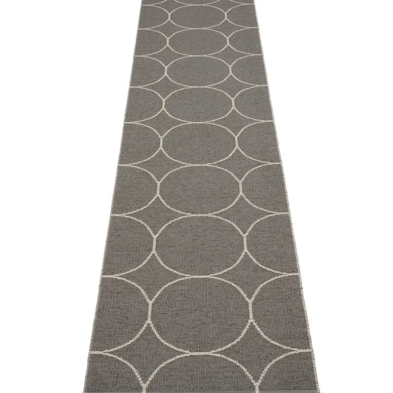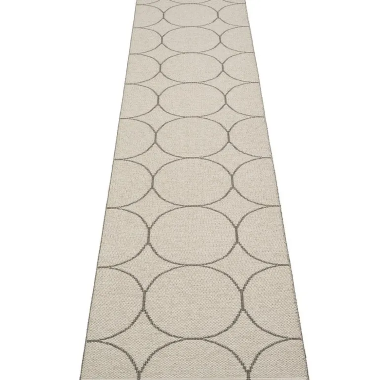 Boo plastmattor från Pappelina är prydda med stora, grafiska cirklar och är vävda på traditionellt sätt i vävstol i Dalarna, Sverige. Mattorna är vändbara och har ett motsvarande mönster på den motsatta sidan. Mattorna är tillverkade av ftalatfria PVC-band, är slitstarka och lättskötta, och de två eleganta färgtonerna går väl ihop med olika inredningar. Mattan kan tack vare sin smala form med lätthet användas som praktfull gångmatta i hallen, som köksmatta eller utomhusmatta. Boo-mattorna har svetsade kanter och en präglad Pappelina-logo.