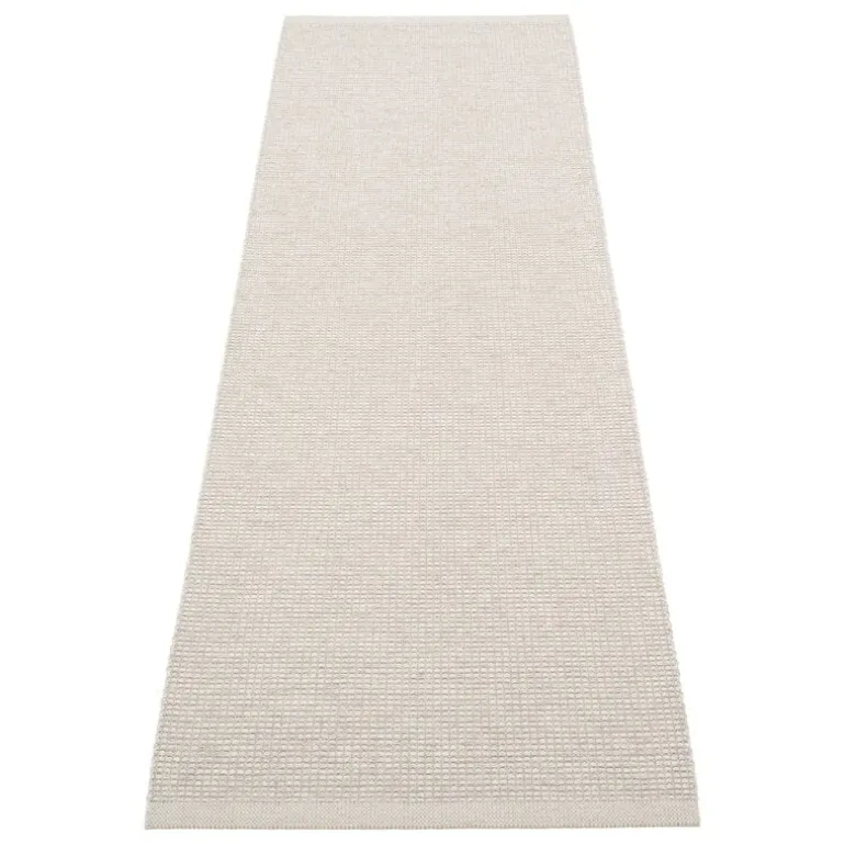 Pappelinas matta Emm ger en fräsch tolkning av varumärkets ikoniska plastmattor genom att blanda ftalatfria PVC-garner med en linvarp. Resultatet är en dynamisk, subtilt metallisk matta som ger en elegant touch till alla utrymmen. Den tåliga och lättskötta Emm-mattan passar perfekt i kök, hall, entré och barnrum. Precis som alla Pappelinas mattor vävs Emm-mattan i Sverige med traditionella metoder.