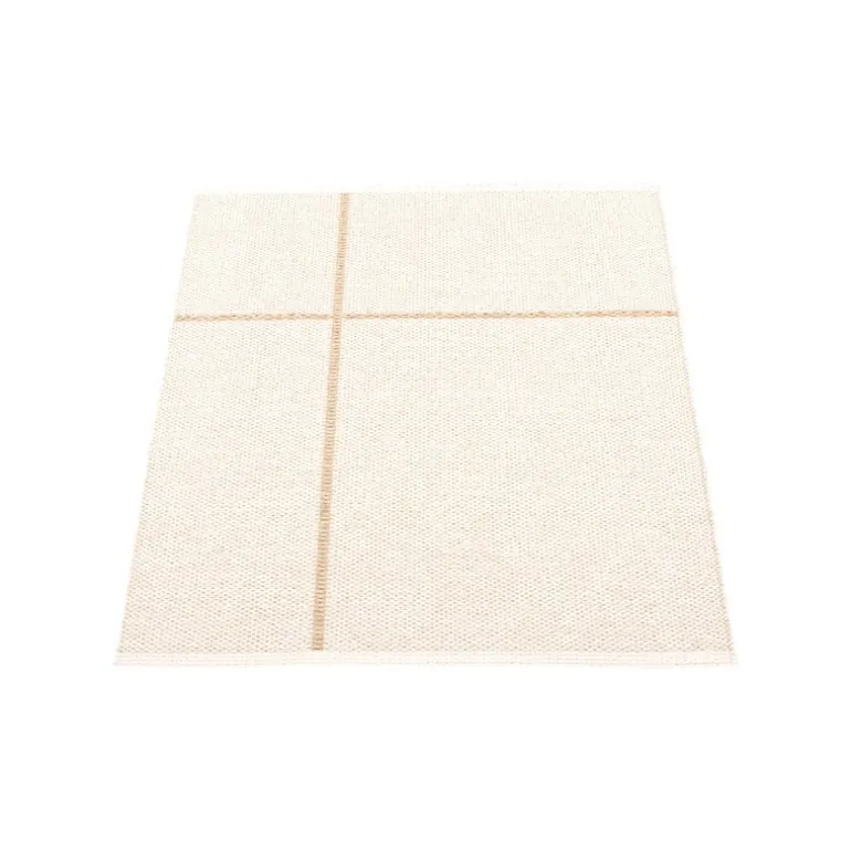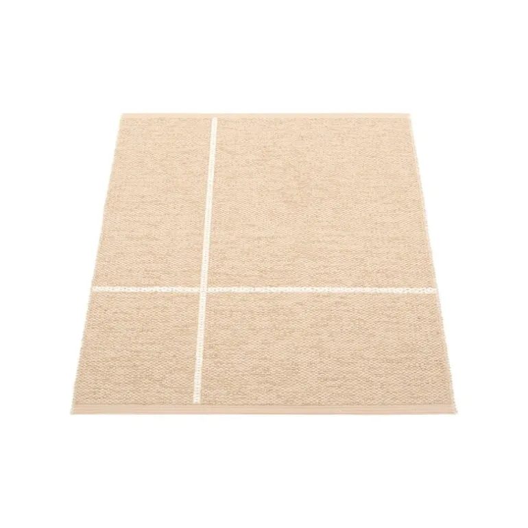 Pappelinas Fred-matta har ett enkelt mönster med korsande ränder som tillsammans med bakgrunden skapar intressanta geometriska former. En dubbelsidig design innebär dubbel glädje: du kan vända på mattan när du känner att det är dags för en ny färg. De dubbelvikta kanterna är fållade med en stark söm.