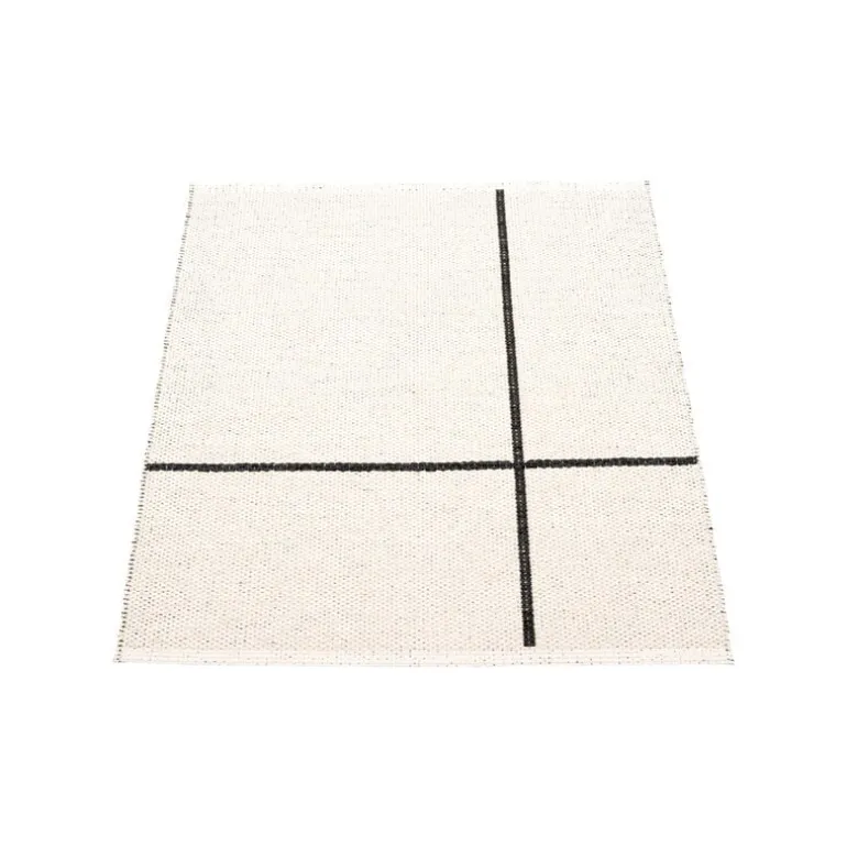 Pappelinas matta Fred har ett enkelt mönster med korsande ränder som tillsammans med bakgrunden skapar intressanta geometriska former. En dubbelsidig design innebär dubbel glädje: du kan vända på mattan när du känner att det är dags för en ny färg. De dubbelvikta kanterna är fållade med en stark söm.