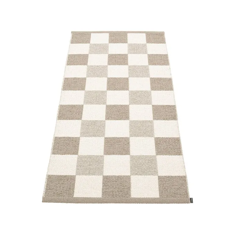 Mattan Pix från Pappelina har ett klassiskt rutmönster vävt i tre olika färger. De dubbelvikta kanterna är fållade med en stark söm, och i det ena hörnet finns en gummietikett med Pappelina-logon insydd. Pix-mattan kan tvättas för hand eller i maskin.