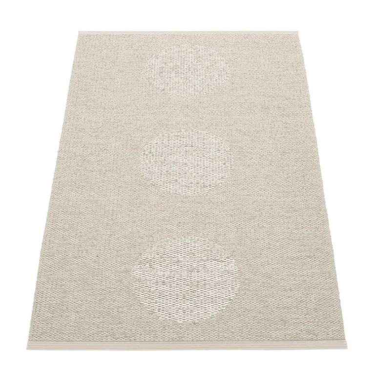 Pappelinas matta Vera 2.0 har ett mönster som utgörs av en rad stora punkter, som ger inredningen en enkel men samtidigt originell stil och dessutom inslag av matt metallglans. Det dubbelsidiga utförandet är också till dubbel glädje: det är bara att vända på mattan när du känner att det är dags att byta färg. Kanterna på mattan är förstärkta och svetsade för att hålla längre, och du kan tvätta mattan för hand eller i maskin.
