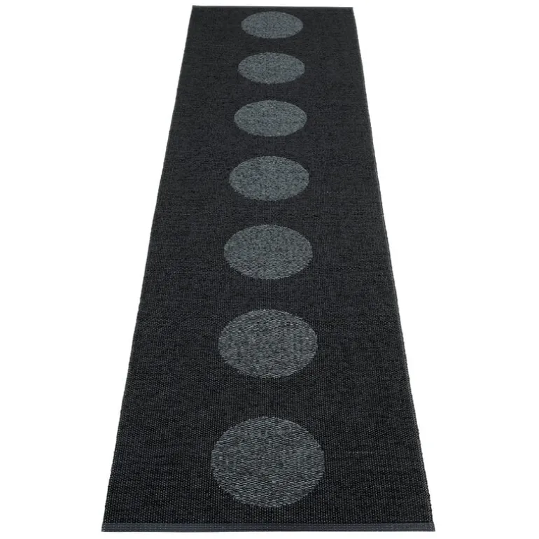 Pappelinas matta Vera 2.0 har ett mönster som utgörs av en rad stora punkter, som ger inredningen en enkel men samtidigt originell stil och dessutom inslag av matt metallglans. Det dubbelsidiga utförandet är också till dubbel glädje: det är bara att vända på mattan när du känner att det är dags att byta färg. Kanterna på mattan är förstärkta och svetsade för att hålla längre, och du kan tvätta mattan för hand eller i maskin.