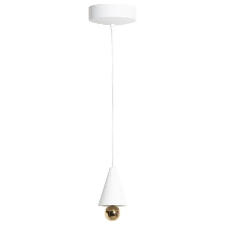 Petite Fritures Cherry-pendellampa har en rolig design som kommer att tilltala alla som gillar geometri och minimalism. Lampan består av en enkel metallkon och en skimrande gyllene sfär fäst vid dess plexiglasbas. Enligt formgivarna Daniel To och Emma Aiston från Daniel Emma, hänvisar lampans form till de nymodigheter av suddgummin som de brukade samla på som barn – mer specifikt en glassbägare toppad med ett körsbär. Cherry är en modern pendellampa som fångar ögat och erbjuder ett subtilt och behagligt ljus.
