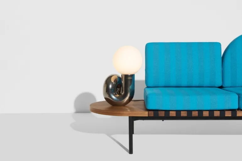 Petite Fritures bordslampa Neotenic har en lekfull design som kombinerar en bastant, böjd keramikfot med en nedtonad glaskupa. Lampan skapades av designduon Jumbo med bas i USA, och inspirationen till fotens korkskruvsliknande form kommer från den italienska pastasorten cavatappi. Den komplexa formen tillverkas i flera steg av skickliga keramiker i Portugal. Den skulpterade lampan, som inspirerats av popkonst, fyller rummet med en glad känsla och ett mjukt ljus, och passar lika bra som blickfång i ett minimalistiskt inrett rum som som komplement till starka färger och djärva former.