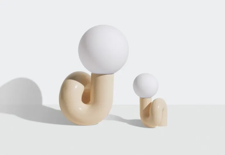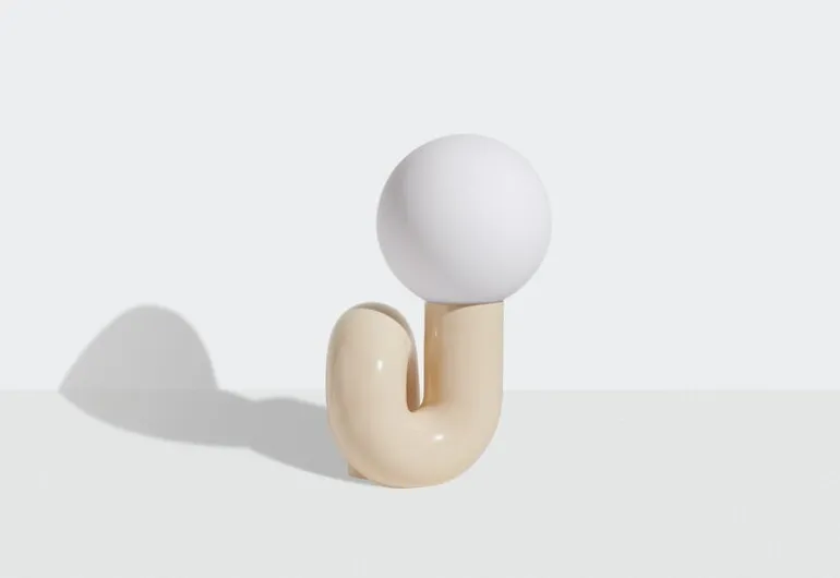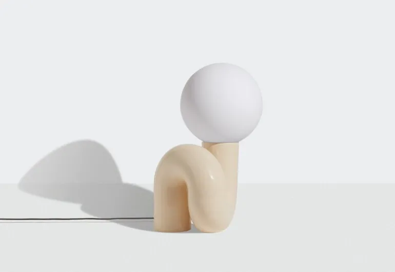 Petite Fritures bordslampa Neotenic har en lekfull design som kombinerar en bastant, böjd keramikfot med en nedtonad glaskupa. Lampan skapades av designduon Jumbo med bas i USA, och inspirationen till fotens korkskruvsliknande form kommer från den italienska pastasorten cavatappi. Den komplexa formen tillverkas i flera steg av skickliga keramiker i Portugal. Den skulpterade lampan, som inspirerats av popkonst, fyller rummet med en glad känsla och ett mjukt ljus, och passar lika bra som blickfång i ett minimalistiskt inrett rum som som komplement till starka färger och djärva former.