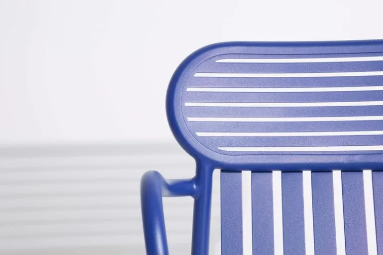Week-end bridge är en stol som ingår i Petite Fritures kollektion med utemöbler i aluminium. Week-end bridge är en snygg karmstol som kännetecknas av ovala former, den har både horisontella och vertikala lameller på ryggstödet. Alla stolarna i serien Week-end är stapelbara.