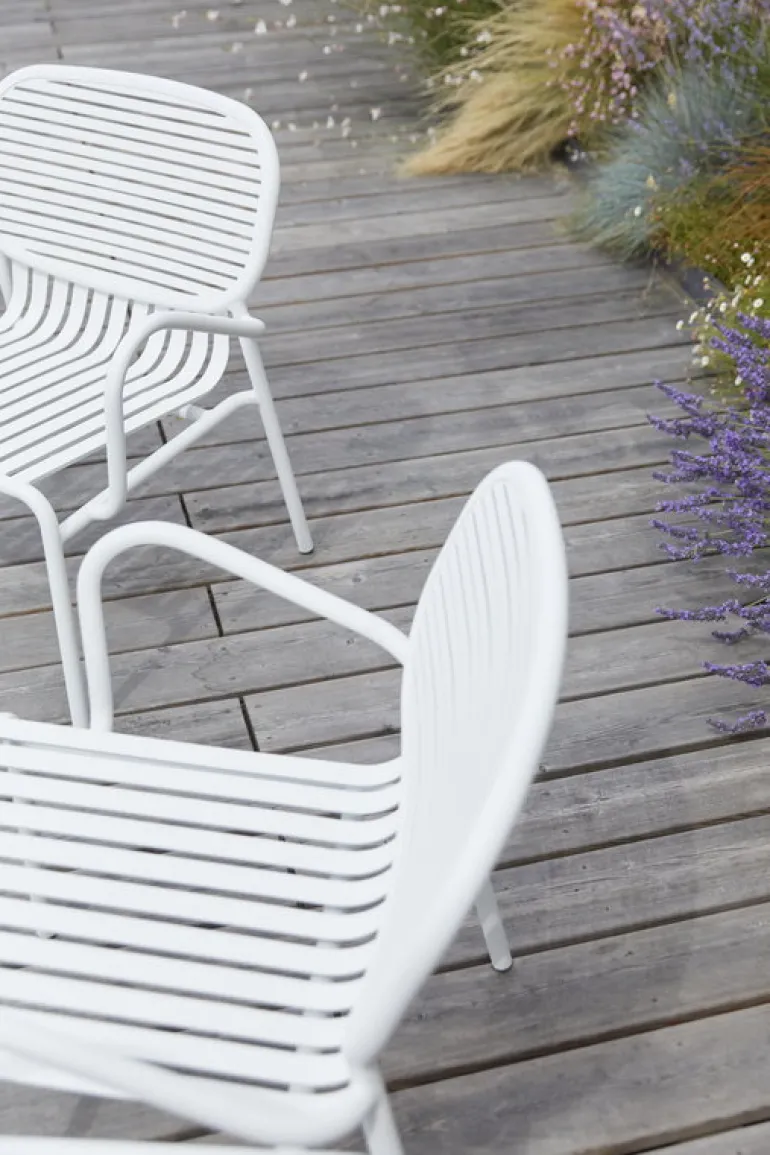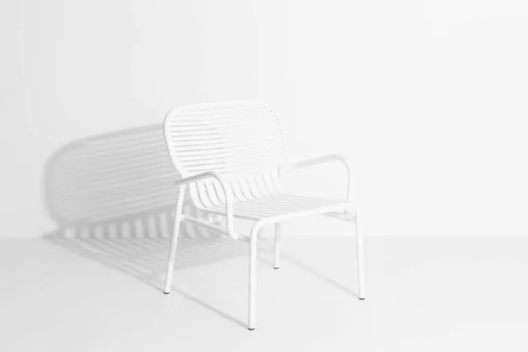 Week-end är en fåtölj som ingår i Petite Fritures kollektion med utemöbler i aluminium. Week-end fåtölj kännetecknas av ovala former med både horisontella och vertikala lameller på ryggstödet. Alla stolarna i serien Week-end är stapelbara.