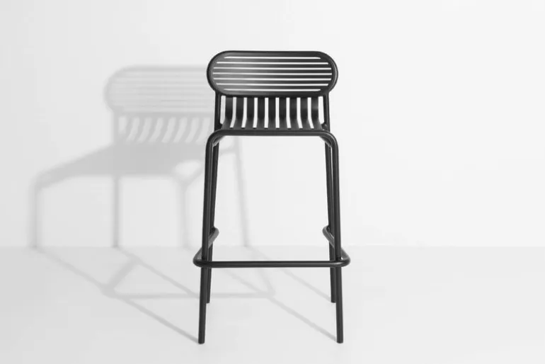 Week-end är en hög pall som ingår i Petite Fritures kollektion med utemöbler i aluminium. Week-end hög pall kännetecknas av ovala former med både horisontella och vertikala lameller på ryggstödet. Den här stilrena barstolen är vacker tillsammans med det höga bordet från Week-end kollektionen.