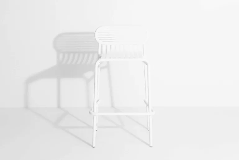 Week-end är en hög pall som ingår i Petite Fritures kollektion med utemöbler i aluminium. Week-end hög pall kännetecknas av ovala former med både horisontella och vertikala lameller på ryggstödet. Den här stilrena barstolen är vacker tillsammans med det höga bordet från Week-end kollektionen.