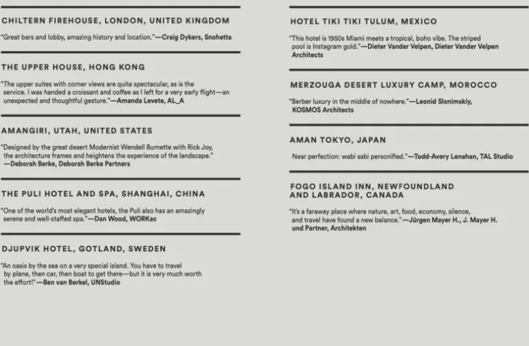 Det finns ingen som uppskattar en byggnad riktigt lika mycket som en arkitekt – och nu, för första gången, har över 250 världsledande arkitekter delat med sig av sina insidertips om de bästa hotellen att bo på, allt från kända destinationer till gömda pärlor. Den här unika guiden listar inte mindre än 1200 platser i över hundra länder för alla möjliga behov, oavsett om det handlar om en affärsresa eller solsemester, en kort weekendresa eller en riktigt lång resa, bröllop eller företagsevent. Det är en perfekt källa till inspiration, gåva och inkörsport till designmedvetna resor världen över.