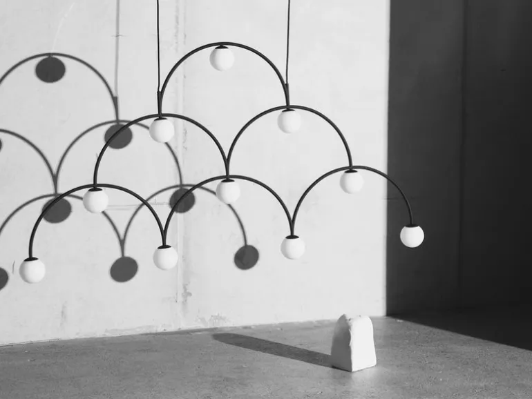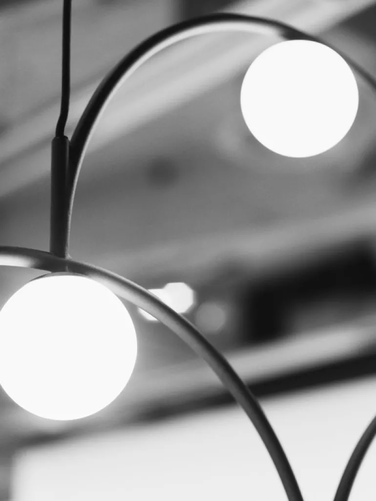 Bounce 169 pendellampan, som skapades av Monika Mulder för Pholc, är en omgivande ljuskälla såväl som en hängande skulptur i ett. Lampans svartmålade metallbågar och glober i opalglas skapar ett delikat och energiskt uttryck på samma gång som fångar blickar oavsett rummet den placeras i, må det vara i hem eller allmänna utrymmen. Den platta skärmliknande Bounce 169 är idealisk för alla utrymmen där det behövs ett mjukt diffust ljus och en definierad fokalpunkt.
