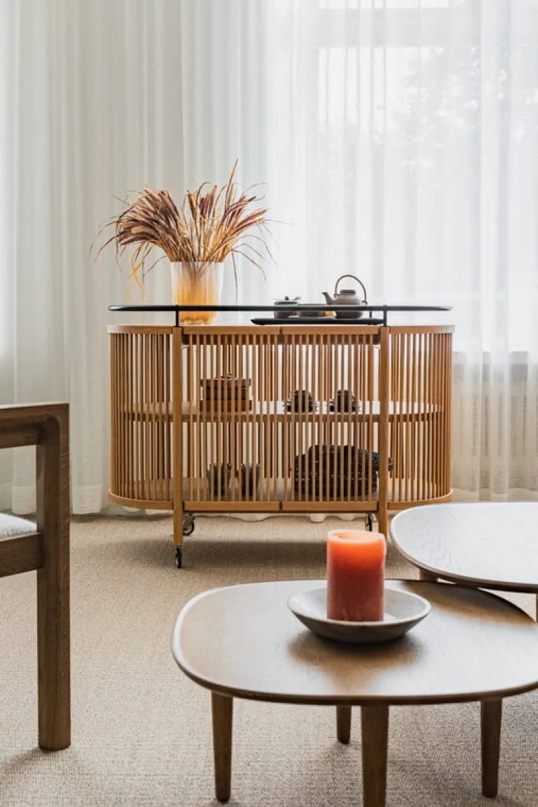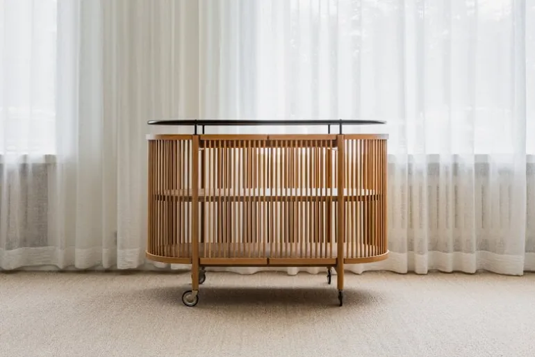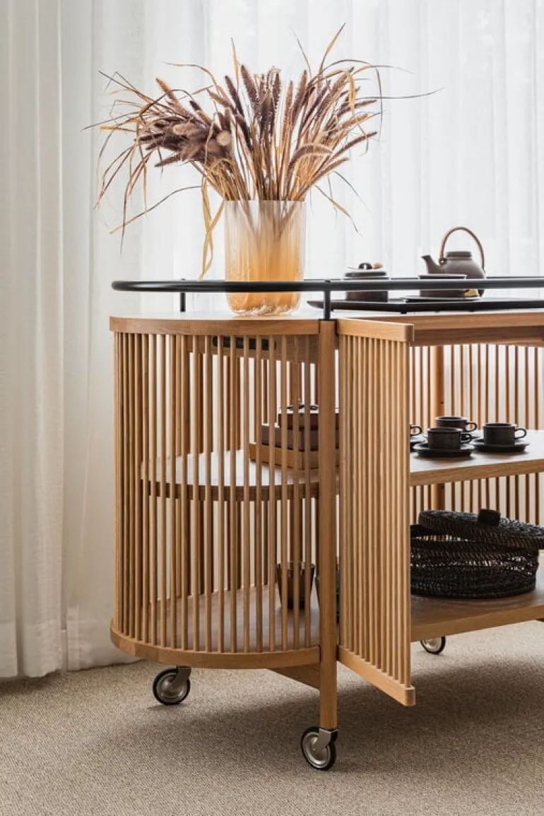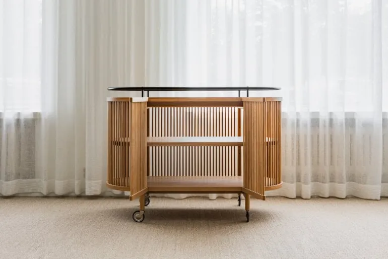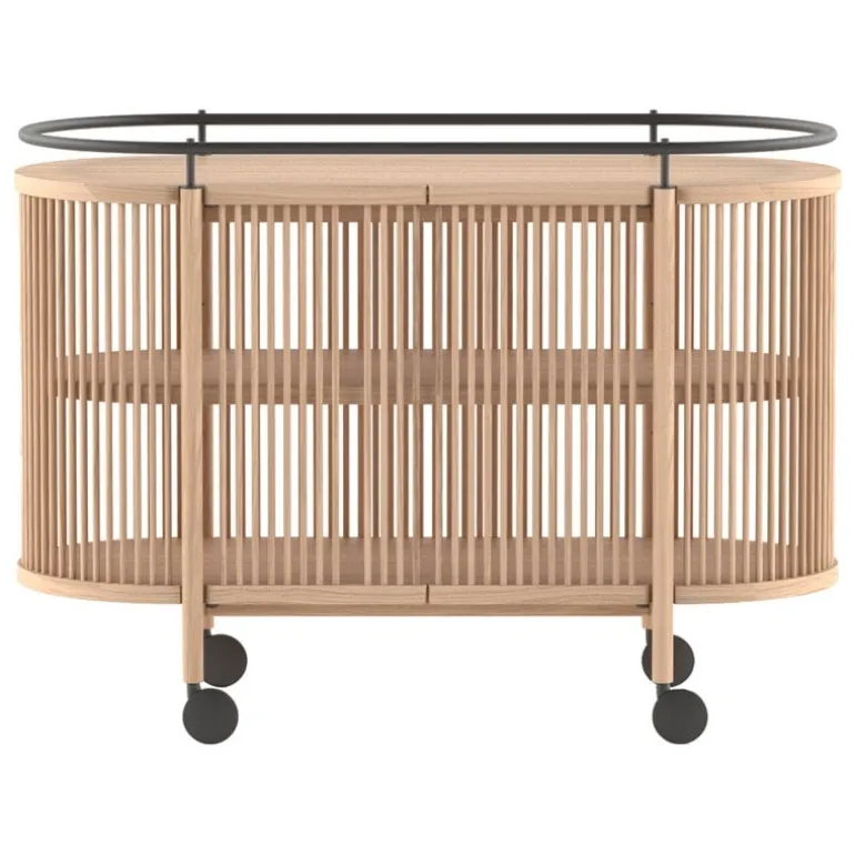 Drinkvagnen Bastone skapar en förtrollande scen för en mixologs bästa skapelser eller en samlares värdefulla porslin. Den är försedd med hjul och barskåpets eleganta dörrar döljer två hyllor som rymmer en mängd glas, cocktailingredienser eller ett elegant te- eller kaffeset. Bastone har ett elegant metallräcke kring ovansidan som ser till att glas och flaskor står säkert på plats även när vagnen är i rörelse.