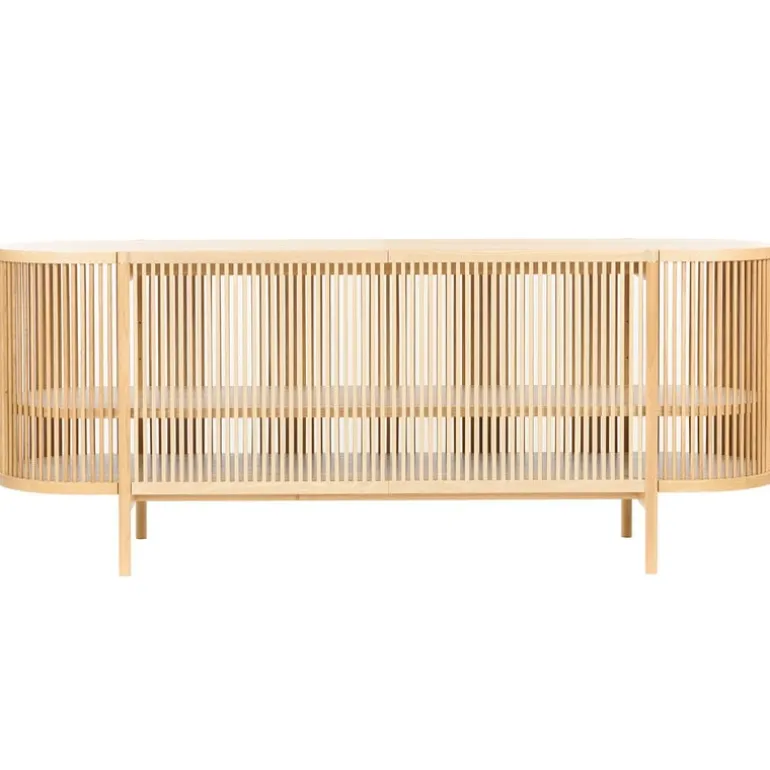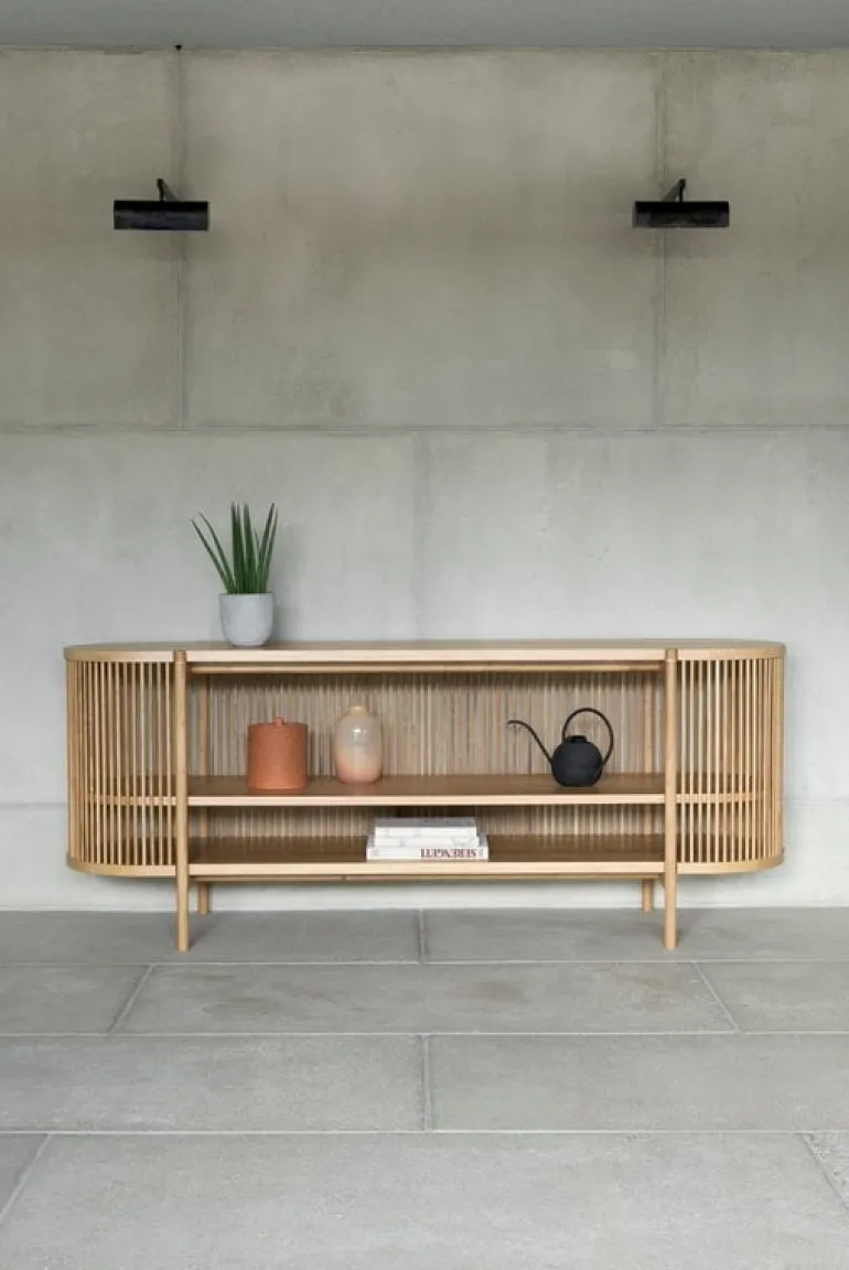 Bastone sideboard är ett tidlöst och skulpturalt konstverk som formgivits av trädesignern Antrei Hartikainen för finska Poiat. Sidorna i det massiva sideboardet är gjorda i trälameller, de filtrerar ljuset in i möbeln och gör att den kastar vackra skuggor omkring sig. De tjocka hyllorna och den massiva överdelen ger en stabil struktur. De utgör också en vacker kontrast till de transparenta sidorna. Bastone är en förtrollande vacker miljö för dina favoritsaker, oavsett rum. Fyll den med böcker och prydnadsföremål i vardagsrummet eller använd den för att förvara porslin i köket. Tack vare den öppna strukturen, kan du också placera en krukväxt eller en snygg lampa i den.