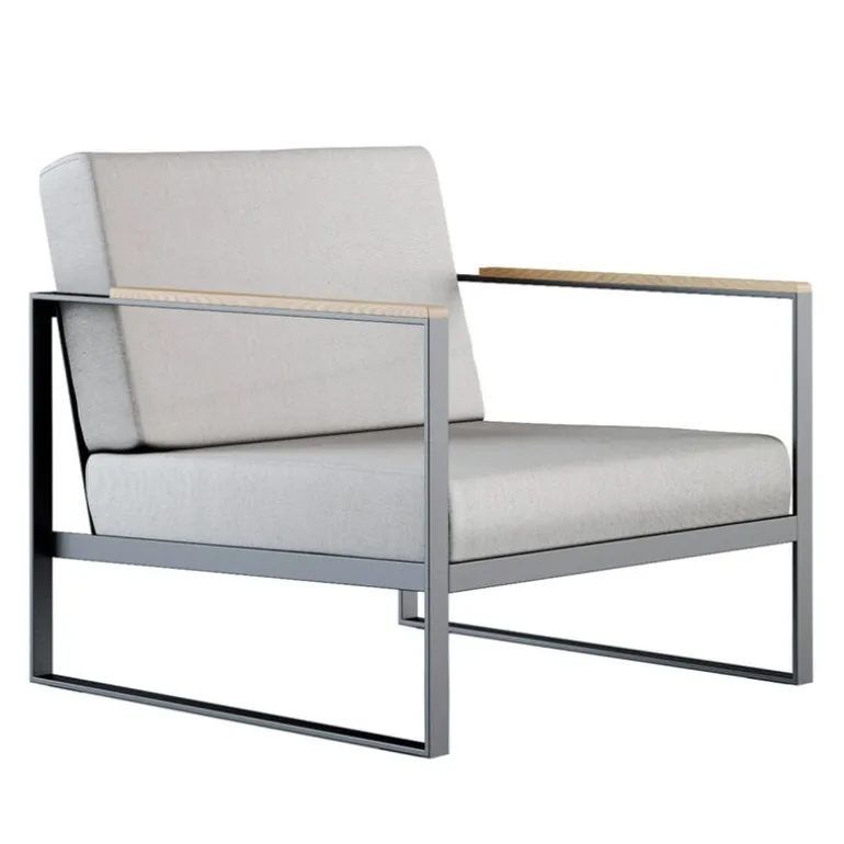 Röshults Garden Easy-fåtölj är ett modernt sätt att koppla av utomhus. Fåtöljen har belagts med Sunbrella-tyg för att tåla fukt och lite regn.