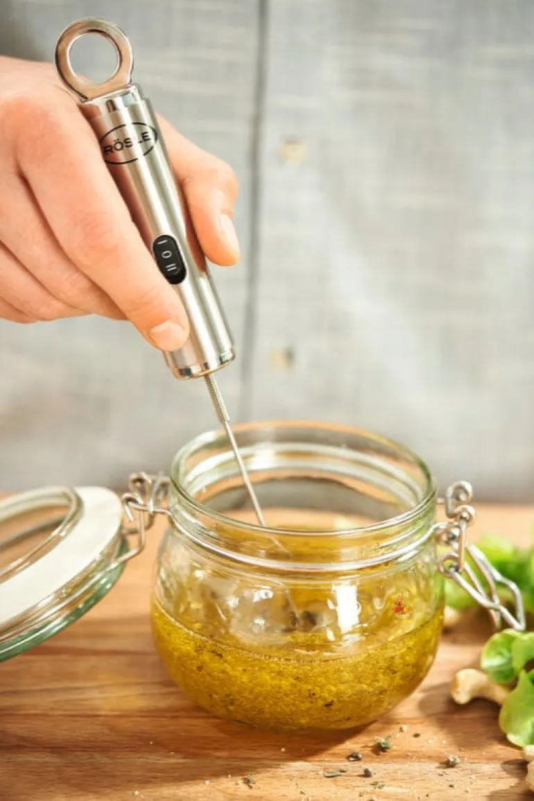 Rösles mjölkskummare ger din morgonkaffe en elegant touch. Med två hastighetsinställningar kan du med den batteridrivna vispen enkelt vispa upp mjölk och mjölkdrycker i hög hastighet, medan den låga inställningen passar perfekt till att blanda salladsdressing, vinägrett och marinader. Mjölkskummaren är tillverkad i polerat rostfritt stål och är inte bara praktisk utan även snygg nog att hängas upp på väggen, så att den alltid finns inom räckhåll när du behöver den.