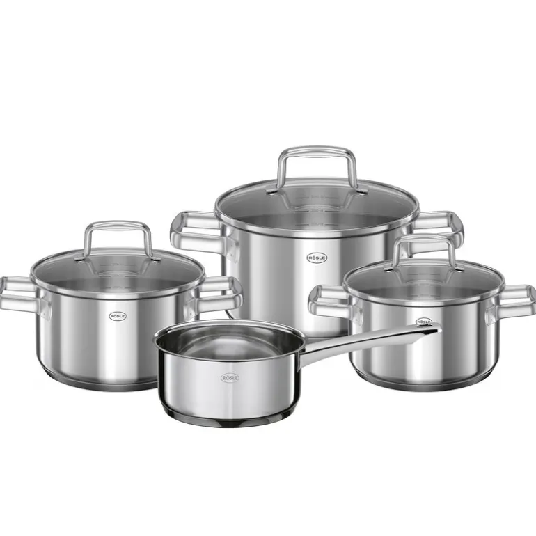 Rösles kokkärlsset Moments är en dröm som gått i uppfyllelse för alla hemmakockar. Det sofistikerade sju-delarssetet innehåller en 1,5-liters kastrull, en 2-liters gryta, en 3,6-liters gryta, en 5,8-liters gryta och tre genomskinliga lock som låter dig hålla koll på maten utan att ta av locket. De mångsidiga grytorna är tillverkade i rostfritt stål av hög kvalitet och passar i ugnen och på alla typer av spishällar, inklusive gas och induktion.