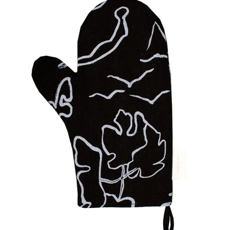 Onnenmaa-ugnshandsken från Saana ja Olli kännetecknas av ett organiskt mönster format av mänskliga figurer, växter och andra naturelement. Onnenmaa (”Arkadien”) är målat med lösa penseldrag och avbildar ett drömlikt tryggt utrymme i en ostabil värld. Alla Saana ja Olli-produkter är tillverkade av slitstark 100 % hampa och de passar vardagslivet. Produkterna är transparent tillverkade i Finland.