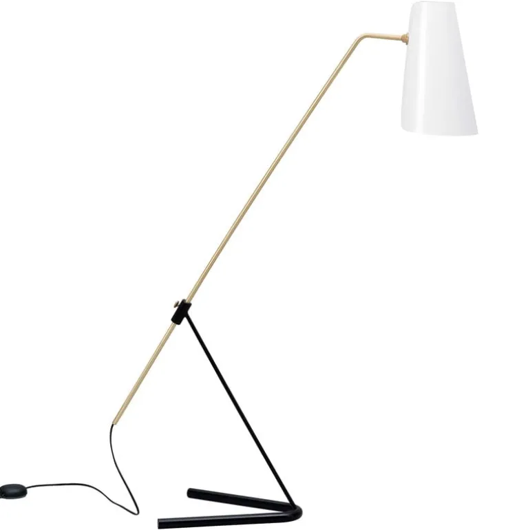 Sammodes golvlampa G21 representerar den franska formgivaren Pierre Guariches stil i sin renaste form, både vad gäller estetik och funktionalitet. Armaturen designades 1951 och består av en tunn metallplåt som skärm samt ett smalt ben med en justerbar mässingsstång, så att du kan ändra både belysningen och lampans utseende. G21-lampan ger ett indirekt sken i rummet, eftersom baksidan av skärmen har lämnats något öppen – en innovation som är typisk för Guariches design. Den dimbara G21-golvlampan tillverkas i Frankrike.