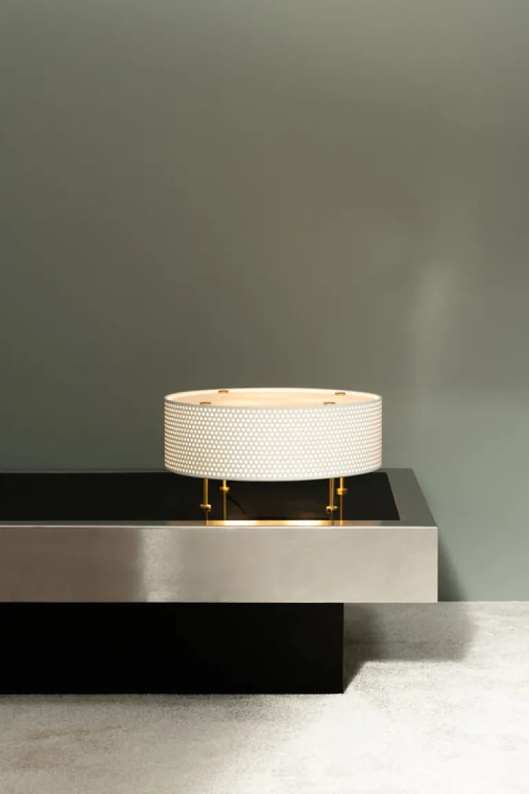Sammodes G50 bordslampa representerar den franska designern Pierre Guariches design i dess mest eleganta och rena form, både estetiskt och funktionellt. Designad 1958, består lampans skärm av en cirkulär akrylfilm och en perforerad metallram. Ljuset reflekteras mjukt både ovanför och under armaturen. Den eleganta lilla lampan står på fyra tunna mässingsben.