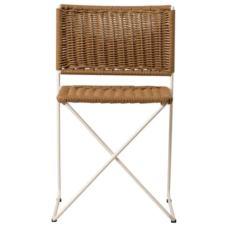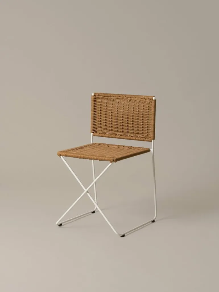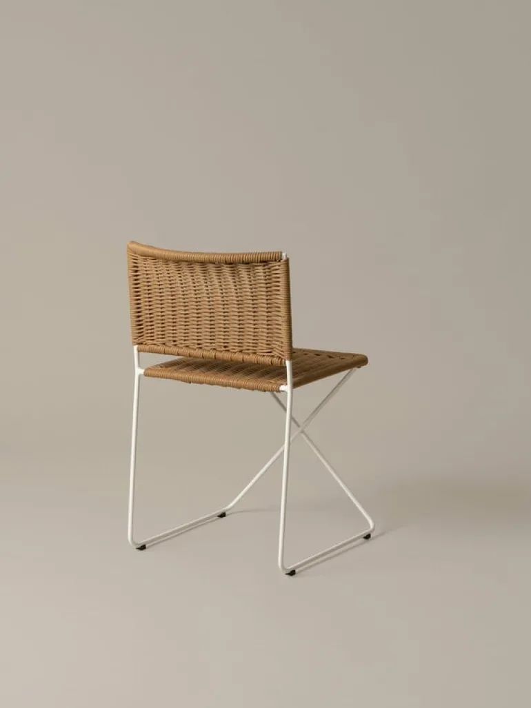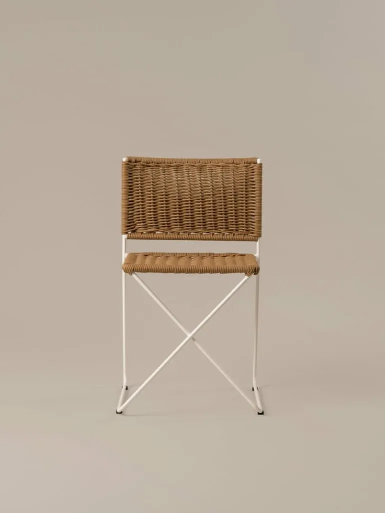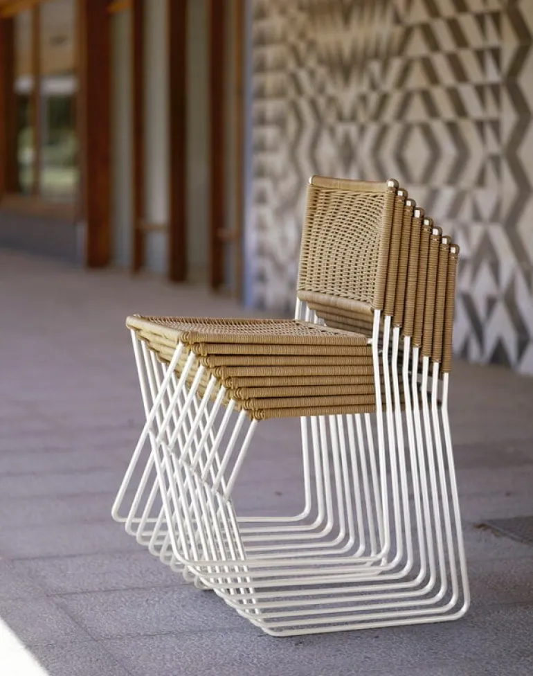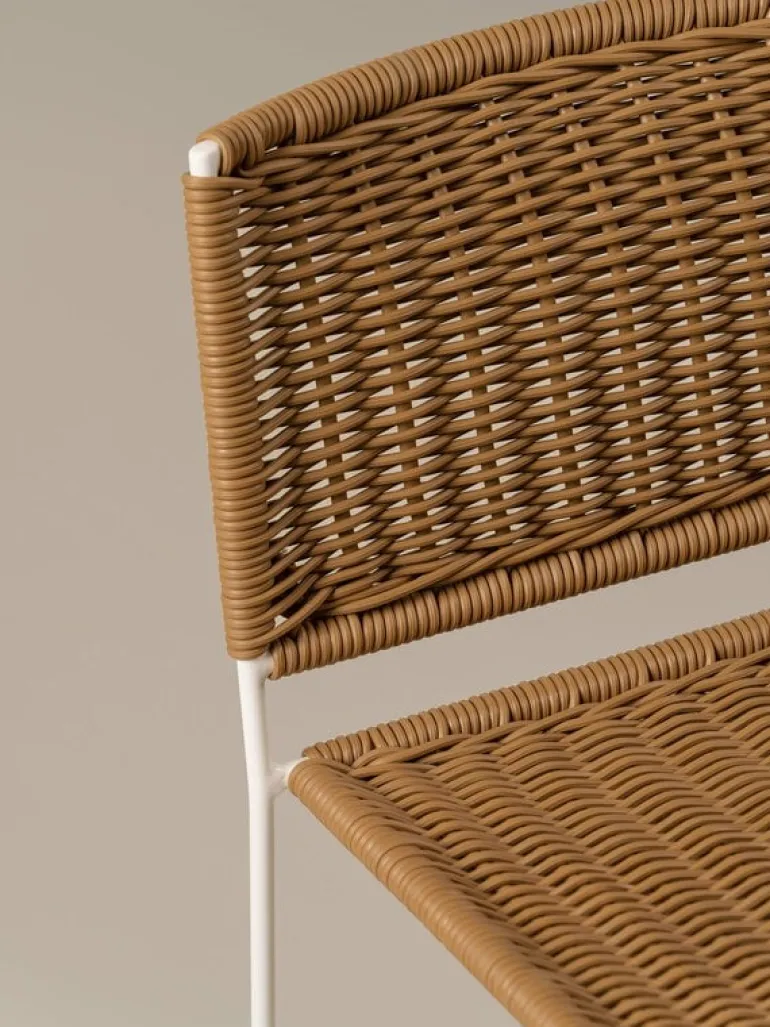 Stolen Ramón från Santa & Cole, formgiven av Ramón Bigas 1975, är en stol med metallram och en sits i tålig, flätad konstrotting. Den här lätta stolen kan användas både inomhus och utomhus, och designen utstrålar ledighet, bekymmerslösa sommarvibbar och spansk charm. Ramón-stolen fungerar lika bra inne vid matbordet som ute på altanen som matstol. Den stapelbara konstruktionen gör det enkelt att förvara stolarna, även i små utrymmen.