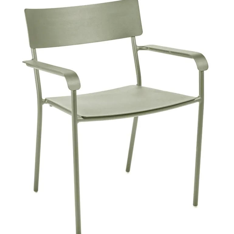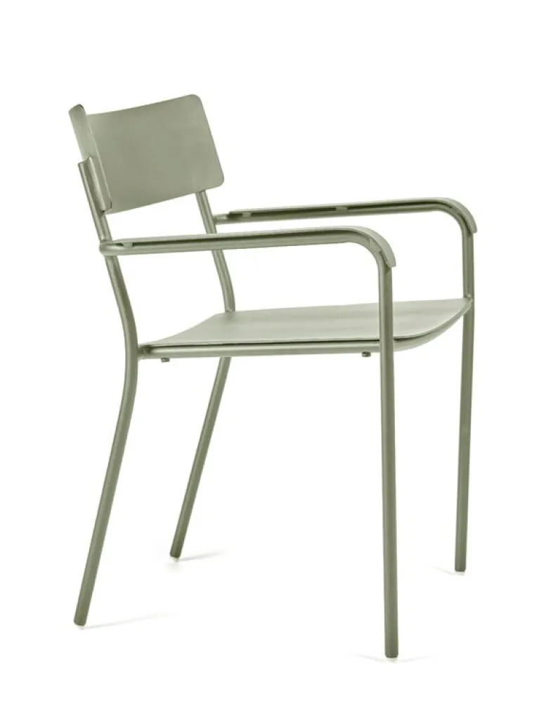 Karmstolen August, från Serax, är tillverkad av pulverlackerad aluminium och är lämplig för både inomhus- och utomhusbruk. Den bredare, relativt låga karmstolen passar lika väl i trädgården eller på uteplatsen som vid ett matbord eller skrivbord inomhus.