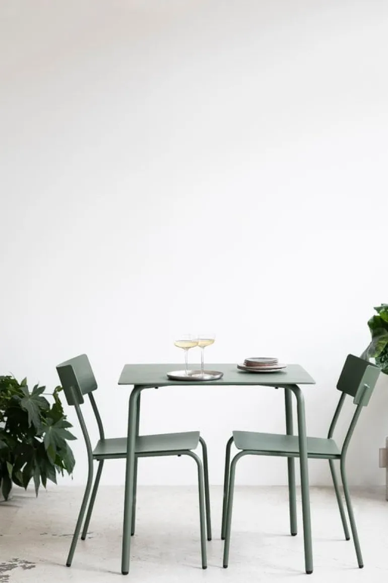 Stolen August från Serax är tillverkad av pulverlackerad aluminium och lämpar sig för både inomhus- och utomhusbruk. Den bredare, relativt låga karmstolen passar lika väl i trädgården eller på uteplatsen som vid ett matbord eller skrivbord inomhus.