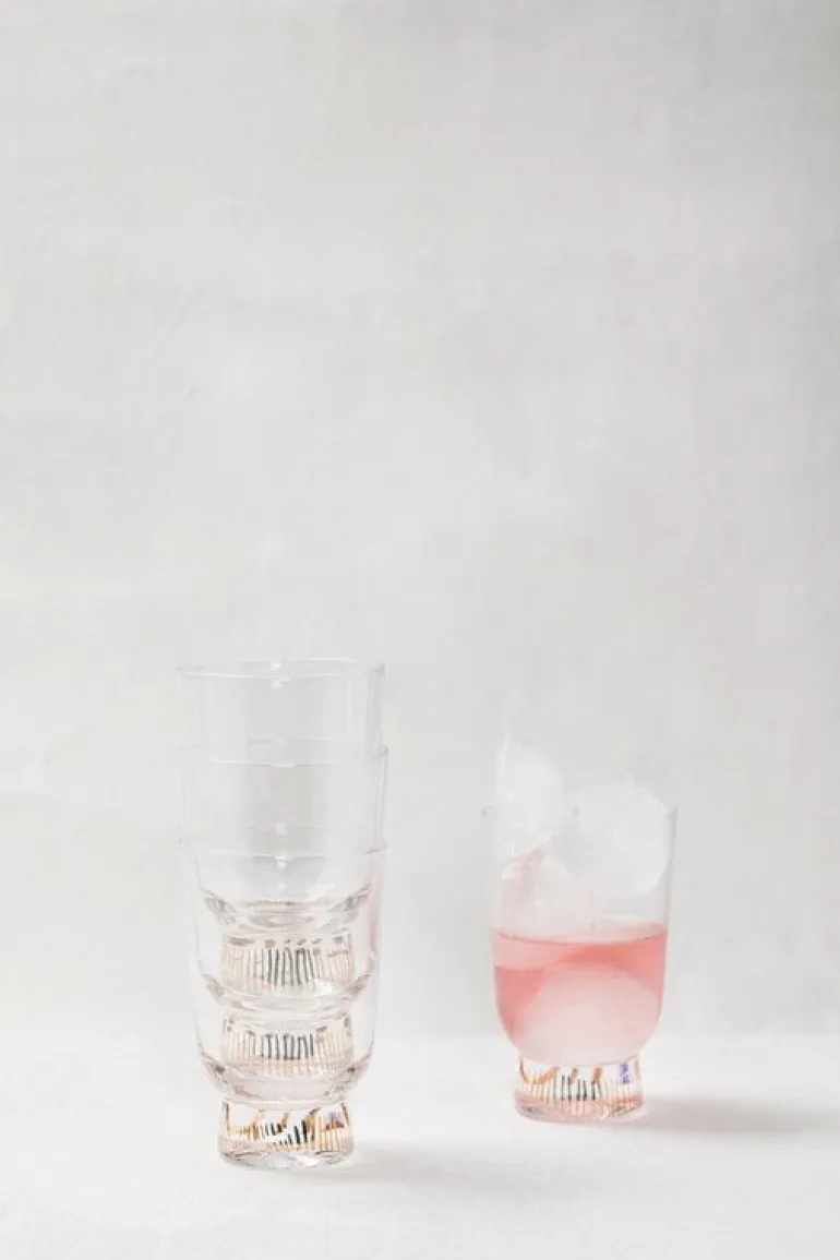 Glaset Feast från Serax pryds av ett mönster med guldfärgade ränder i olika längder och tjocklekar. Det eleganta dricksglaset får även bord som dukats i all enkelhet att kännas festliga. Glaset är perfekt till olika drycker, från vatten till juice och till och med vin. Förpackningen innehåller fyra Feast-glas.