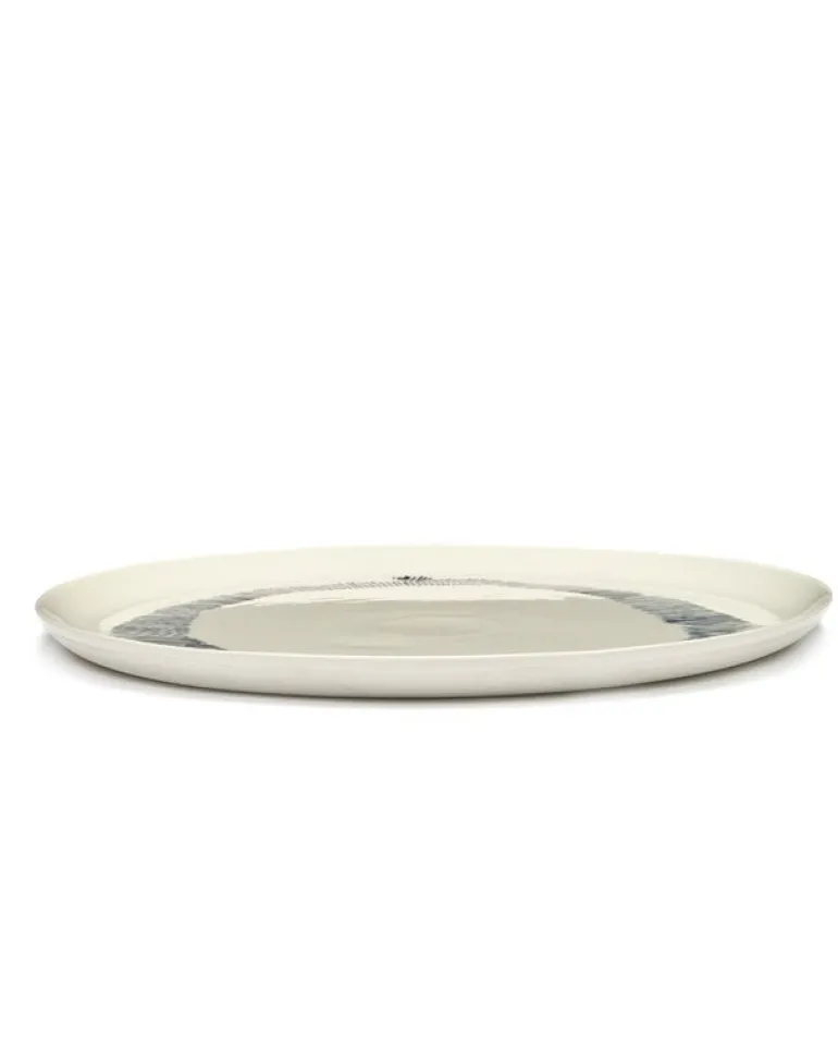 Serax Feast serveringsfat är dekorerat med ett cirkulärt mönster bestående av blå linjer i varierande längder och tjocklekar. Det stora vita fatet är idealiskt för att servera fisk, sallad samt små snacks och andra efterrätter.