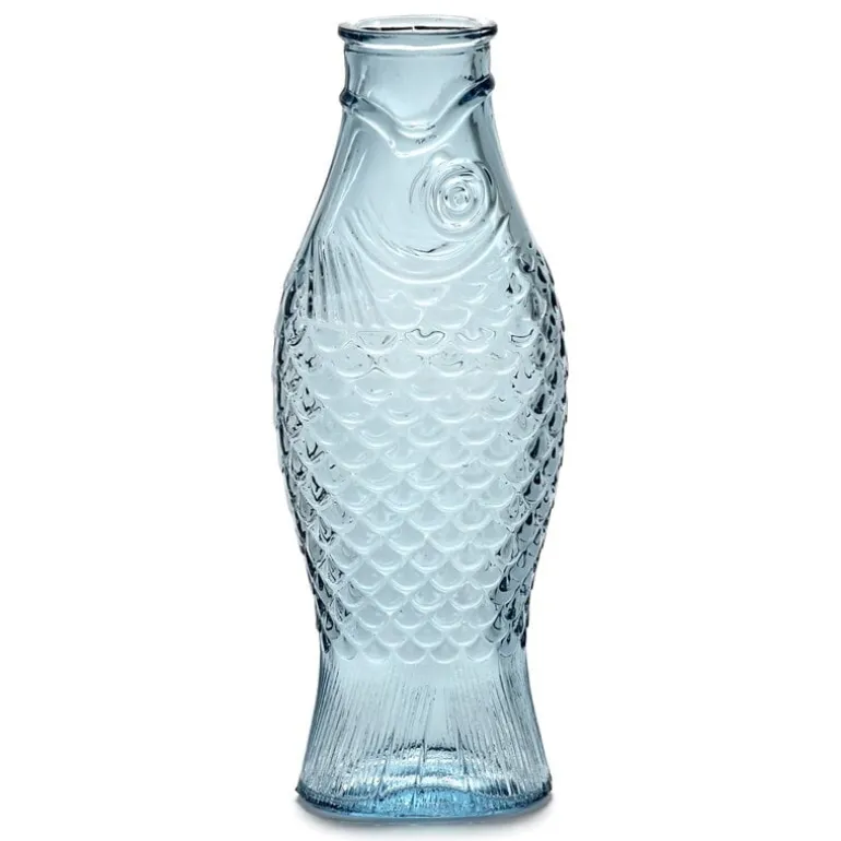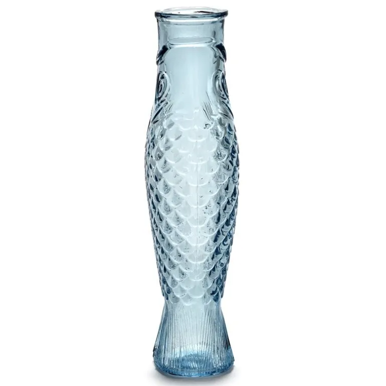 Fish & Fish-flaskan från Serax förtrollar med sitt fiskliknande utseende och distinkta, delikata blåa glas. Flaskan, som liknar en sill, kan användas som en karaff för att servera drycker eller som en vas för blommor, men den ger också glädje som en dekorativ föremål i sig. Designad av Paola Navone, ljuster Fish & Fish-kollektionen upp bordsdukningen med ett gott humör och en antydan till färg.