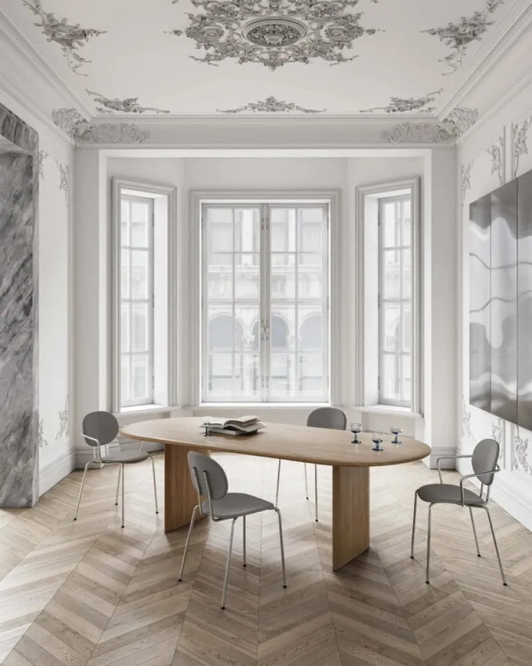 Matbordet Sibast No 7, som designats av Anna och Ditlev Sibast, är ett bord i massivt trä som ger en stabil plattform för både måltider och arbete. Dess siluett definieras av en rymlig, oval bordsskiva och två breda ben, vilket ger bordet ett minimalistiskt och harmoniskt utseende. Bordet är vackert avslutat med mjukt rundade kanter och träådringar som löper över bordsskivan och benen. Inspirationen till bordet har hämtats från Helge Sibasts No 7-stolar, och bordet passar perfekt ihop med dessa stolar, men även med andra trästolar, vilket gör det till ett utmärkt val för matrummet hemma, restauranger eller kontor.