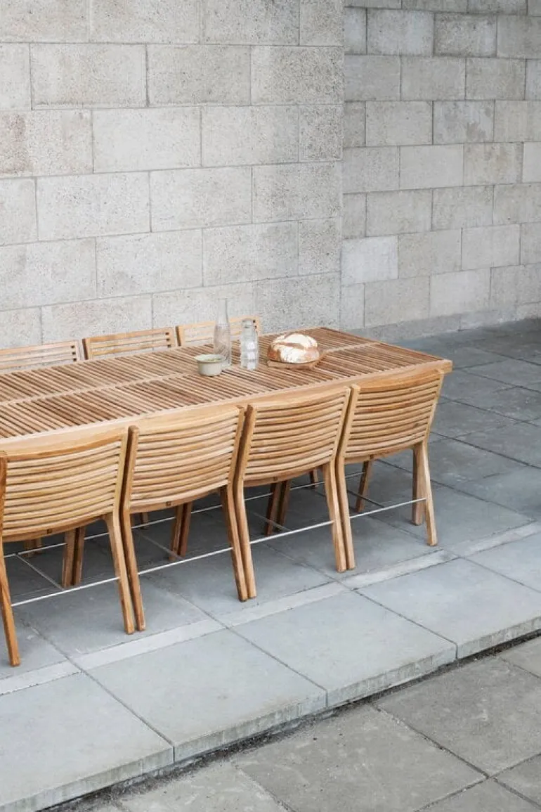 Matstolen RIB är tillverkad av obehandlad teak av hög kvalitet. Med tiden och genom användning kommer stolen få en ännu mer utpräglad stil: teak är ett klassiskt utomhusmaterial som åldras på ett vackert sätt och får en underbar patina med en sofistikerad, silvergrå ton. Den som tycker bättre om den genuina, gyllene nyansen kan vara lugn, eftersom originalfärgen på möbeln kan bibehållas genom att den behandlas med lämpligt impregneringsmedel för teak.