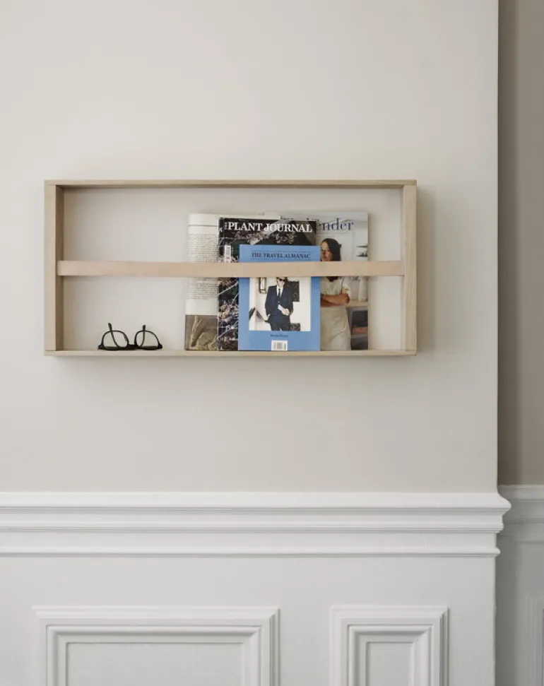 Tidningsstället Norr från Skagerak har en snygg ram i ek för tidskrifter och böcker. De små detaljerna i läder och mässing ger en charmig touch till totalintrycket. Tidningsstället Norr är designat av Ditte Buus Nielsen.