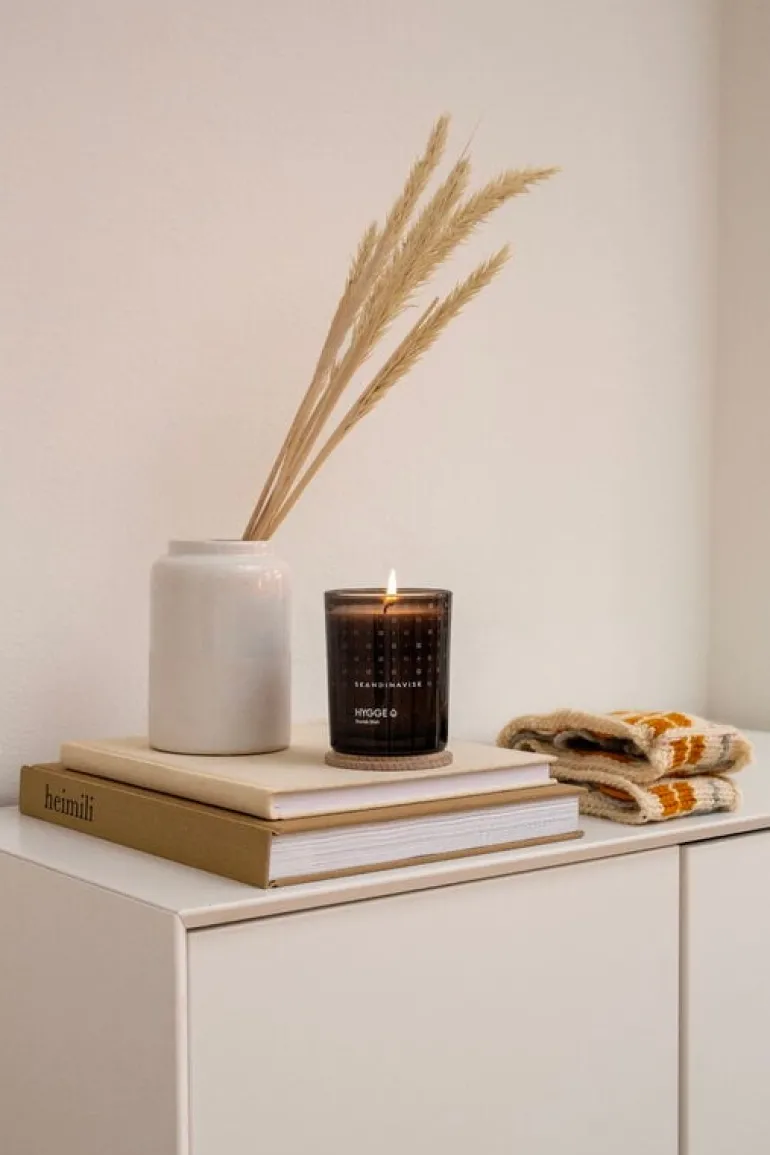 Skandinavisks doftljus Hygge har toner av svart te, mint, torkade äpplen och kanel. Hygge, som inte har någon direktöversättning, syftar på danskt sätt att skapa trivsel och gemenskap i vardagen. Detta doftljus i begränsad upplaga är inneslutet i en genomskinlig glasburk. Ljuset kommer i en presentförpackning och dess trälock fungerar även som ljushållare.