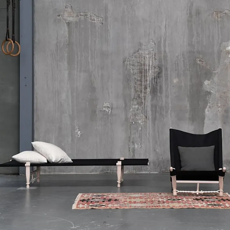 Skovshoved Møbelfabriks safaristol OKG har samma enkla estetik som OGK dagbädd, båda designade på 1960-talet av Ole Gjerløv-Knudsen. Den praktiska stolen levereras i en linneväska med axelrem och monteras snabbt och enkelt – inga skruvar eller verktyg behövs. Ramen är tillverkad av obehandlad bok och överdraget är av svart linnetyg. De tvinnande sisalrepen och de långa bakbenen är en väsentlig del av konstruktionen, samtidigt som de i sig själva utgör vackra detaljer. Safaristolen OGK är perfekt att koppla av i var som helst – i vardagsrummet, i sovrummet, på balkongen och utomhus.