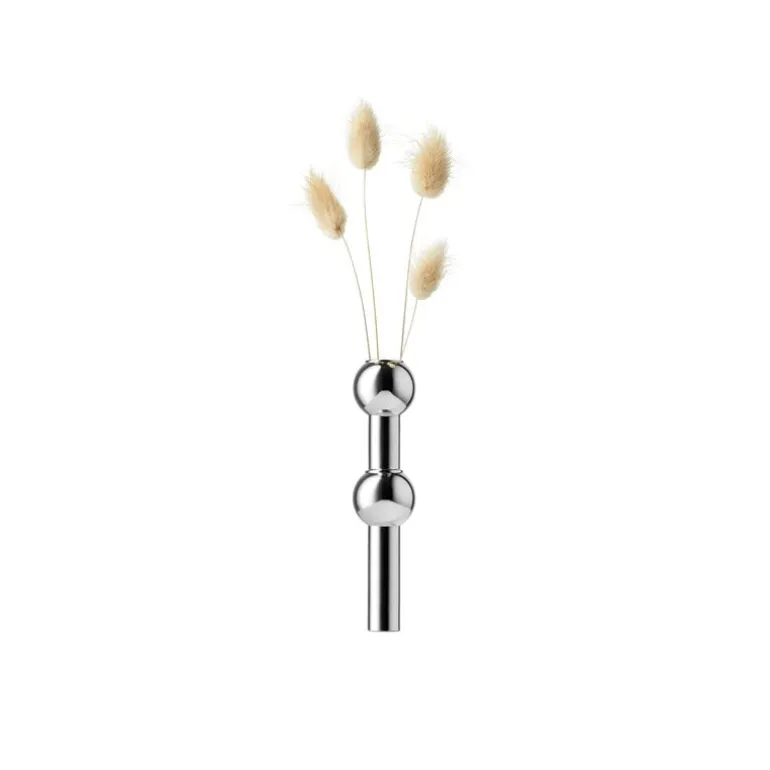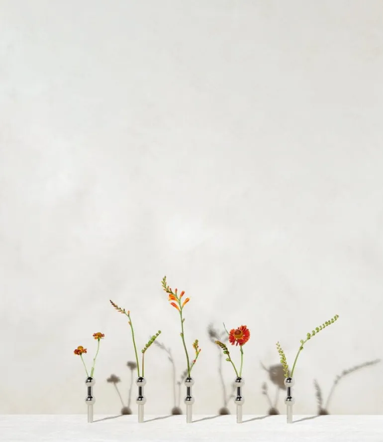 Den minimalistiska vasen ser också vacker ut när den används individuellt, och dess smala form är särskilt lämplig för enstaka blommor, små grenar eller några strån. Den graciösa metallvasen anslöt till STOFF-familjen 2019.