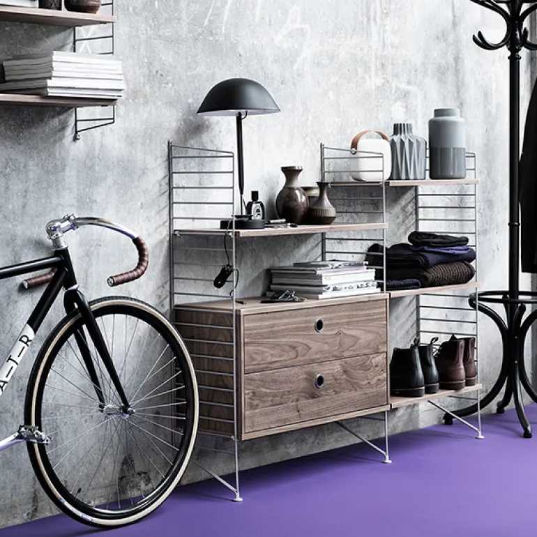 String System är ett mångsidigt, modulbaserat hyllsystem som den svenska arkitekten Nils Strinning skapade år 1949. De karakteristiska, stegliknande golv- och sidopanelerna kan kombineras med hyllor, tidningshyllor, skrivbord, klaffbord, byråer och skåp för att bygga ihop ett system som passar just dina behov. String Systems tidlösa och minimalistiska design passar perfekt i både moderna bostäder och kontor.