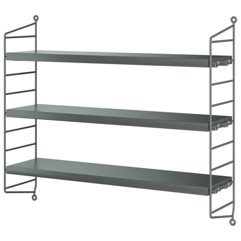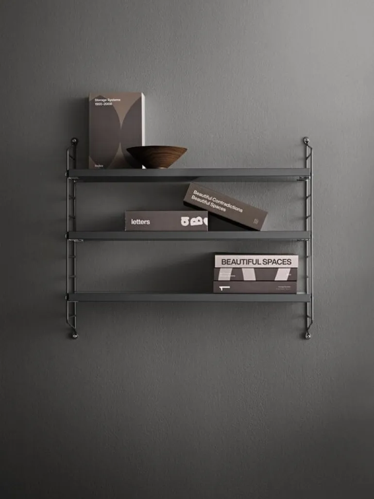 String Pocket är en kompakt och elegant hylla för böcker, samlarobjekt och andra småting. String Pocket lanserades 2005 av den svenska tillverkaren String, och ingår i den populära kollektionen som skapades av Nils Strinning år 1949. Den minimalistiska designen består av tre hyllplan och två stegliknande sidopaneler, som även kan slås ihop till större enheter, både vertikalt och horisontellt. String Pocket finns i ett brett spektrum av färger, och kan användas till en rad olika ändamål och på många olika platser.