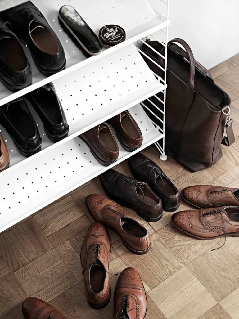 Strings skohylla i metall är särskilt framtagen för hallens och garderobens förvaringslösningar. Skohyllan kan kombineras med de 30 cm breda String-sidopanelerna.