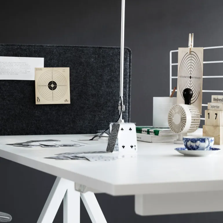 String Works trådskärm fungerar som en halvtransparent avdelare mellan två arbetsstationer. Skärmen skruvas fast i skrivbordet med skruvar.