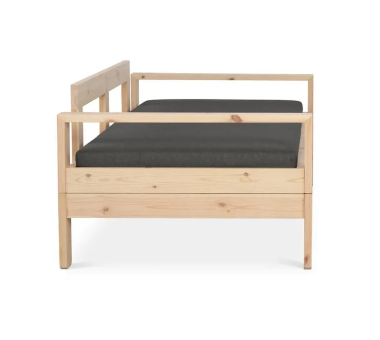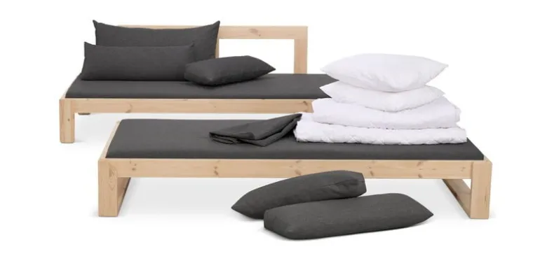 Bäddsoffan Kaiku i Tapio Anttila-kollektionen döljer mer än du kanske anar utifrån sett. Den minimalistiska bäddsoffans vaxbehandlade fururam kan tillsammans med madrasserna göras om till två separata bäddar genom att man helt enkelt lyfter upp den övre delen av ramen och ställer den på golvet. Utrustning till båda bäddarna finns dold inuti soffkuddarna.