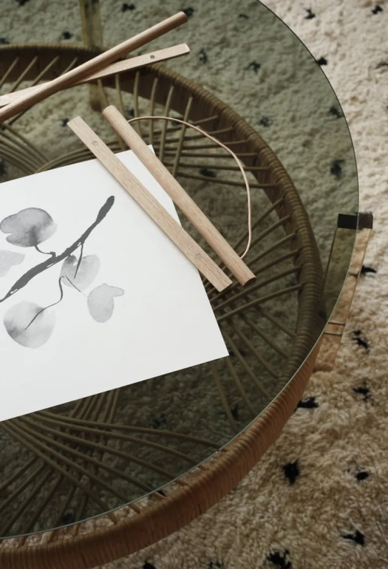 Posterramen i ek är ett vackert och praktiskt sätt att hänga upp posters och tryck på väggen. Tack vare de små magneterna på insidan går det snabbt och lätt att fästa ramen. Ramen är handgjord i Finland och den levereras med ett läderband för upphängning.
