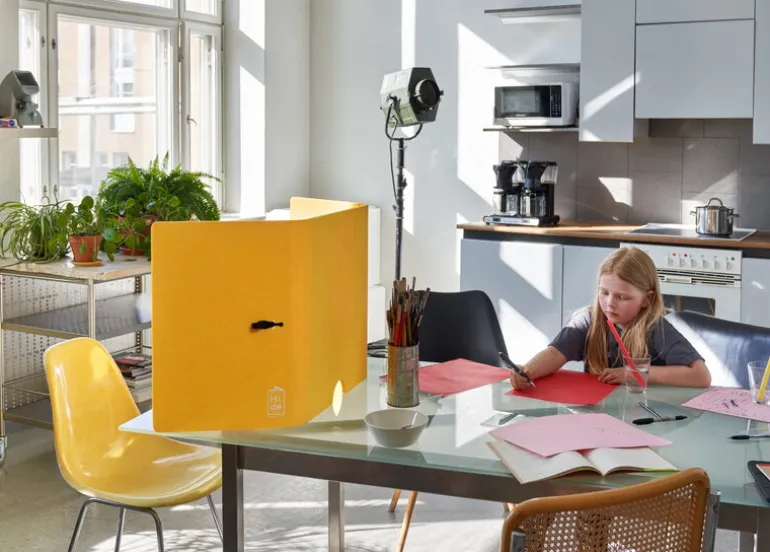 The Hide är en kollektion av skrivbordsskärmar tillverkade av ljudabsorberande och brandhämmande polyesterfiber, som produceras från återvunna plastflaskor. Skärmarna har behandlats med en antiviral och antimikrobiell finish och är icke-allergiframkallande och lätta att hålla rena. Skärmarna tillverkas i England av The Hide, ett företag som specialiserar sig på akustiska inredningslösningar.