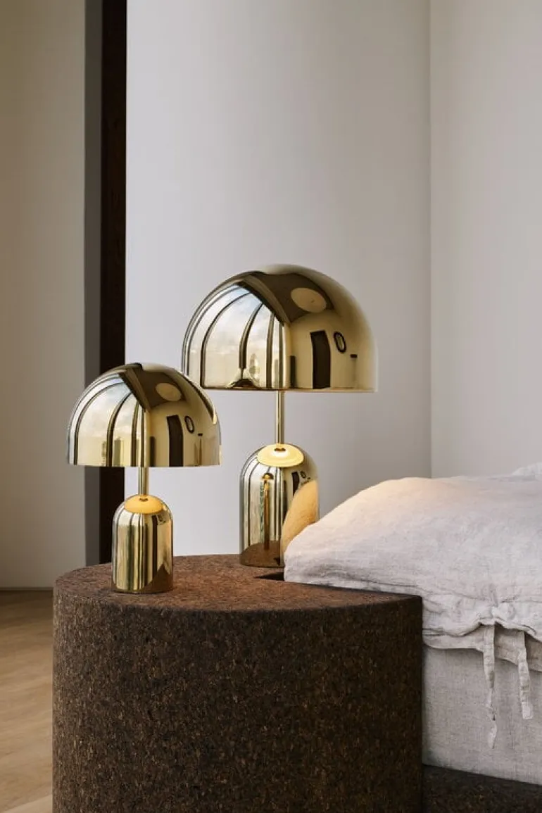 Tom Dixons bordslampa Bell kännetecknas av sin effektfulla blandning av markerade, geometriska linjer och nedtonad enkelhet. Den här bärbara bordslampan består av en påfallande cylindrisk skärm och fot. Båda har behandlats för att få en extra glansig yta, som på ett lekfullt sätt reflekterar form och ljus från omgivningen.
