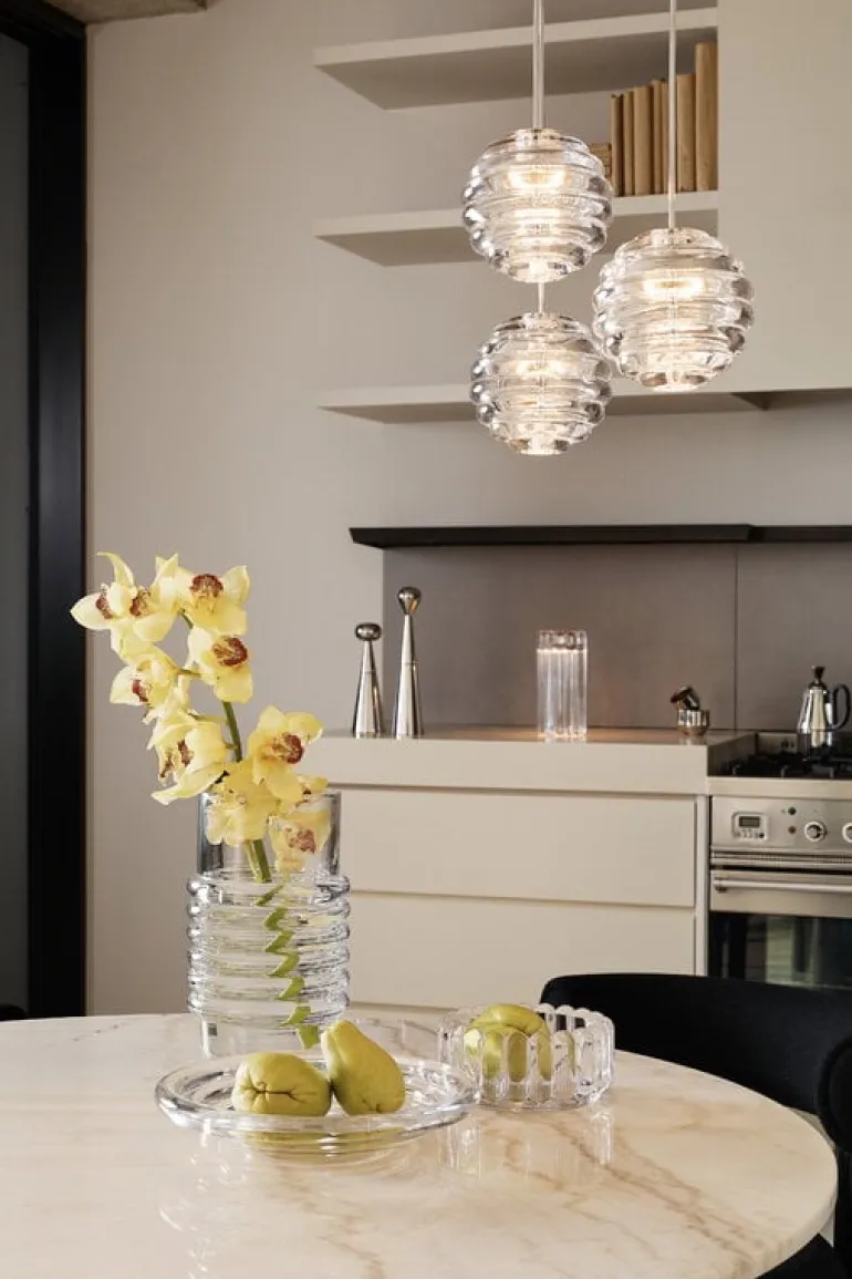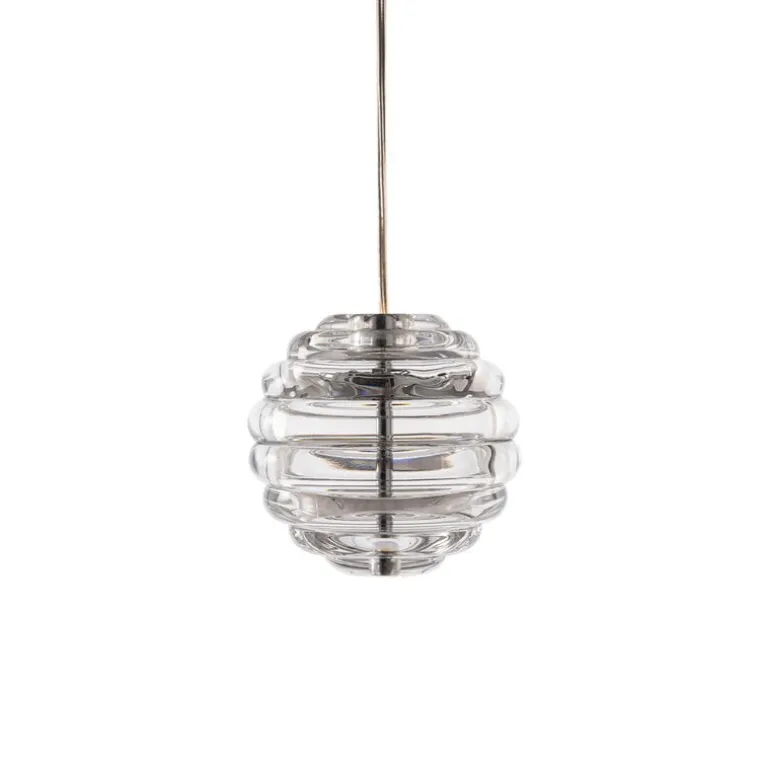 Tom Dixons pendel Press Sphere Mini är en mer kompakt version av märkets Press Sphere-lampa, och den påminner om både bojar och barnleksaker. Ytan på den runda taklampan omges av ett böjt mönster som skapar vackra randiga reflektioner runt omkring när ljuset är tänd. Den vackert svävande, skulpterade pendellampan passar perfekt både i hemmet och i offentliga miljöer. Tack vare sin lilla storlek är lampan särskilt vacker i klungor med flera lampor.