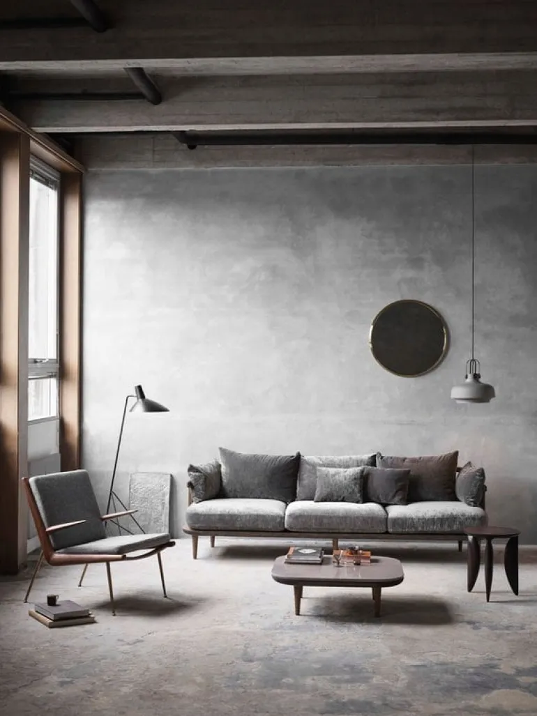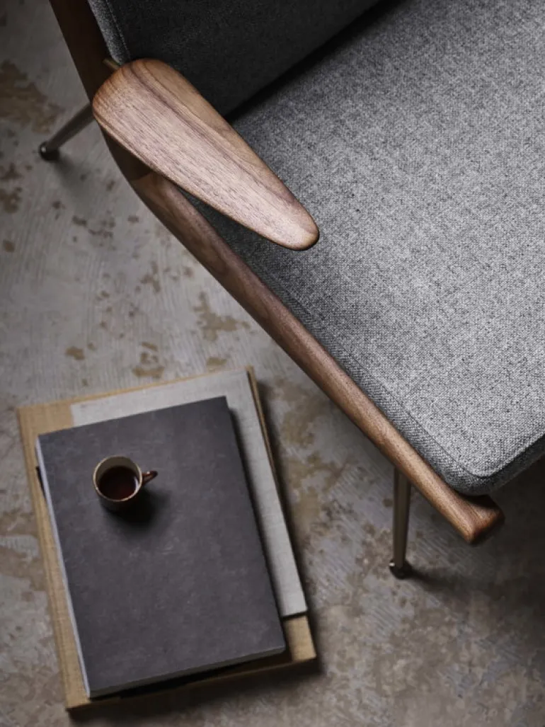 &Traditions Boomerang-fåtölj är ett utmärkt exempel på dansk modernisms minimalistiska estetik. Fåtöljen designades av de gamla mästarna Hvidt & Mølgaard år 1956 och består av mjuka, men eleganta, kuddar och en handpolerad träram som bärs upp av ben i mässing. Den böjda trästången på framsidan är en rolig detalj i den annars simpla designen. Namnet för Boomerang-fåtöljen kommer från formen – när man ser den från sidan ser den L-formade ramen ut som en bumerang.
