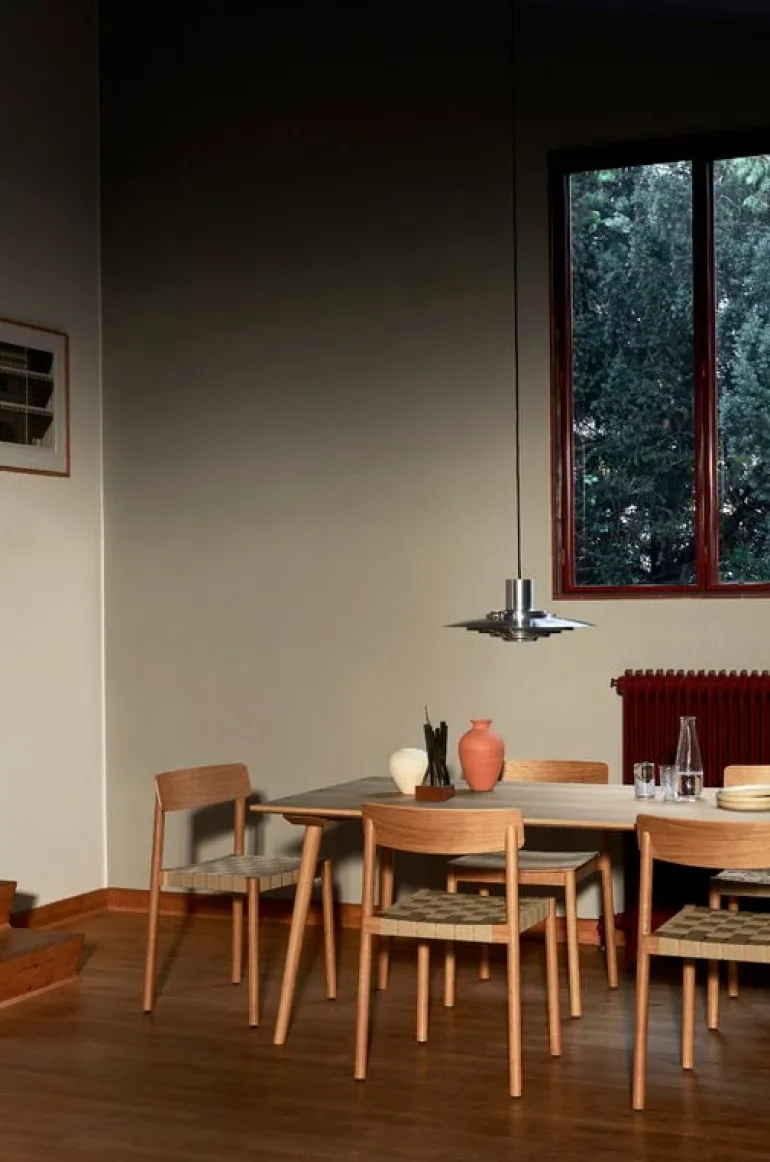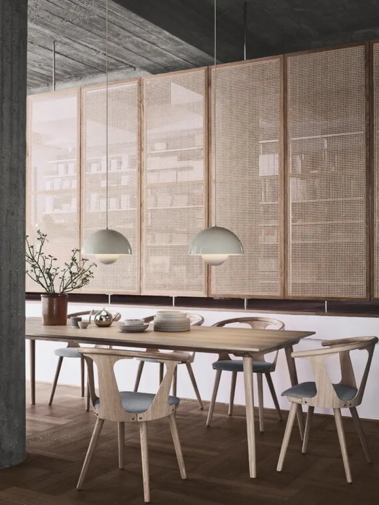 Matbordet In Between från &Tradition är ett elegant tillskott till trämöbelkollektionen som designats av Sami Kallio. Det stora, rektangulära bordet In Between SK6 upprepar formerna och de sluttande benen från stolarna i serien In Between. Matbordet In Between är ett resultat av formgivaren Kallios kärlek till skandinaviskt arv och träbearbetning, och är tillverkat av stark och karaktärsfull ek med traditionella tekniker som träbearbetning. De innovativa fanerteknikerna och de avtagbara benen ger bordet en modern finish och gör att det kan transporteras och förvaras i platt paket.